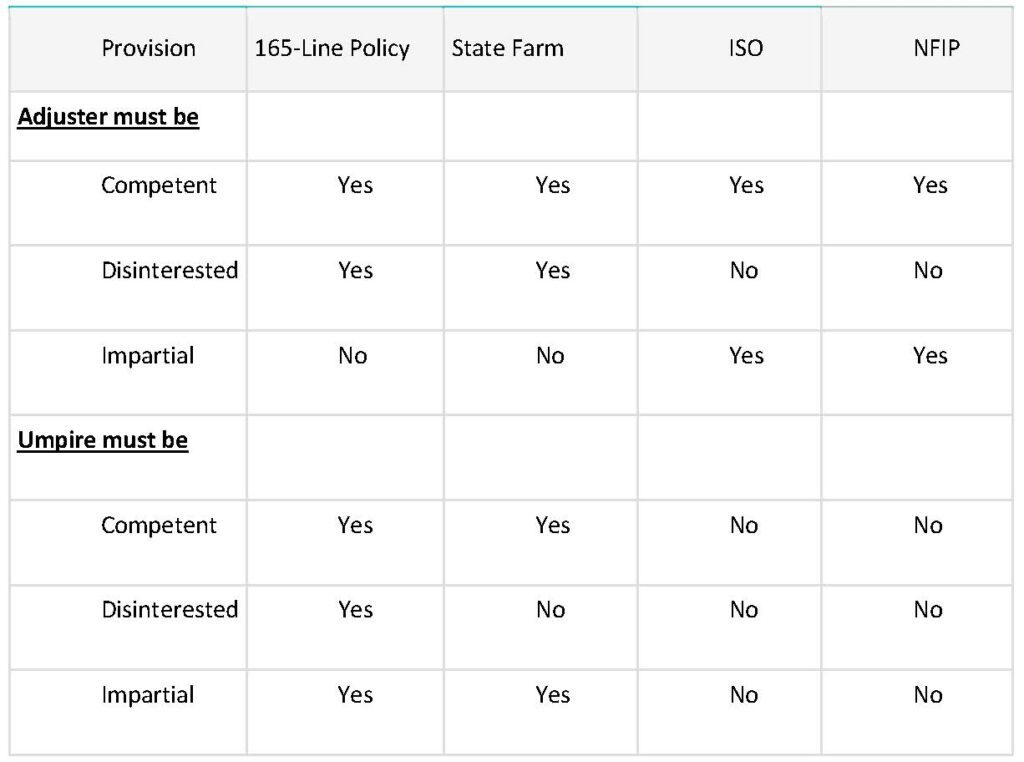 In analyzing four insurance policies: the 165-line, State Farm, ISO with standard HO3, and NFIP, I found that each policy contained very different uses and omissions of competent, disinterested and impartial as it pertains to appraisers and umpires during the appraisal process. Below you will see a chart1 that outlines, for each of the four policies, whether an adjuster or umpire involved must be competent, disinterested, and/or impartial during the process.