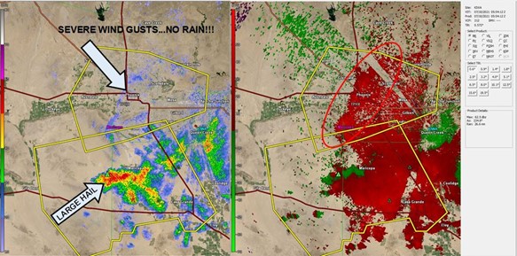 The Doppler radar image below, taken during the late evening on July 9, 2021, shows two severe thunderstorm warnings in effect where the yellow polygons are located.1 The warning on the bottom of the screen is for a severe thunderstorm with heavy rain, large hail, and severe wind gusts of 58 mph or higher. What’s more interesting is the severe thunderstorm warning further north over Phoenix. This severe thunderstorm warning was issued for a thunderstorm that had no rain with it whatsoever. However, Doppler radar was detected severe winds over 58 mph in and around the city of Phoenix associated with an intense gust front that was racing westward from an old thunderstorm.2