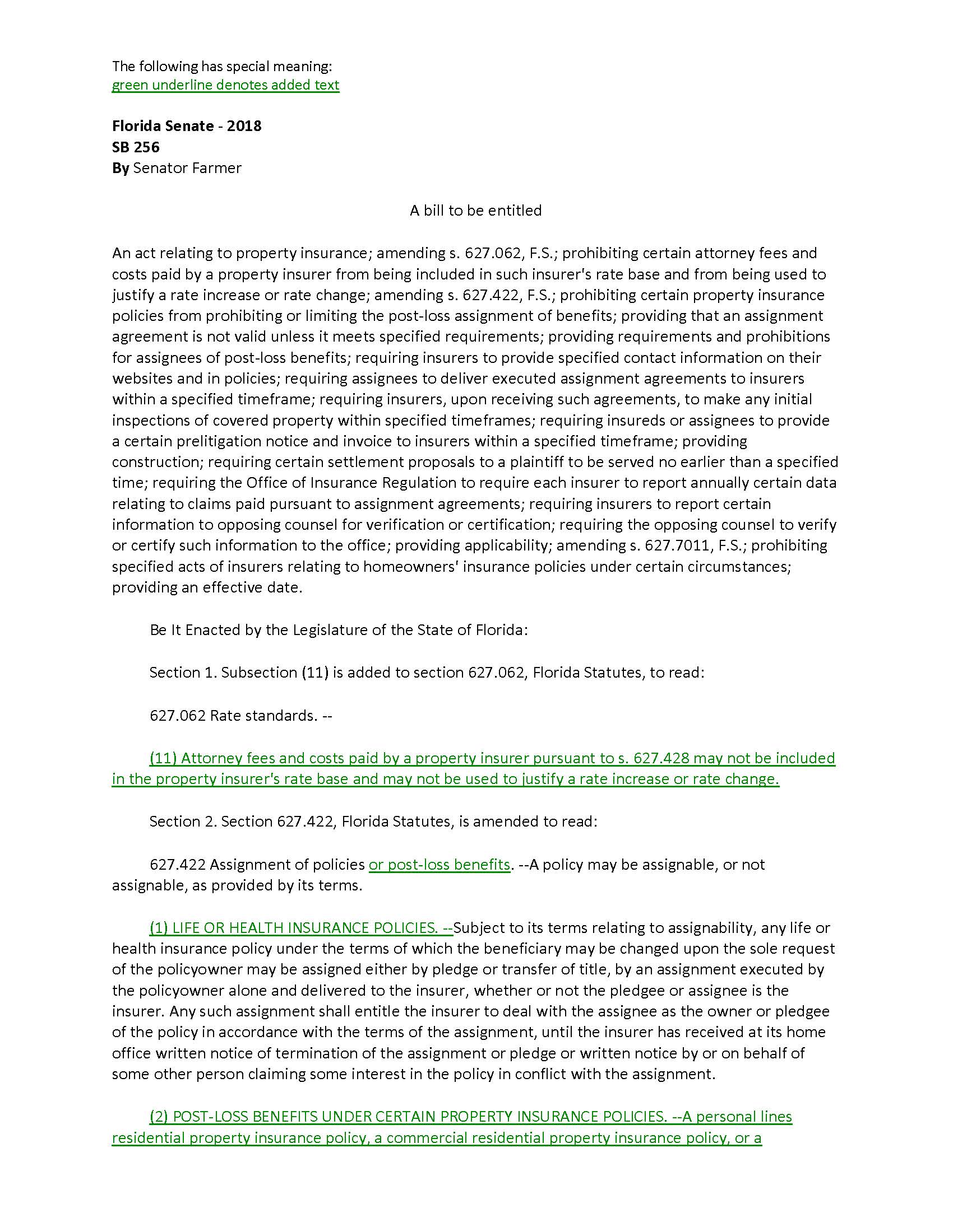 Florida Senator Gary Farmer filed an Assignment of Benefits reform bill in the Florida Senate. As discussed in Unauthorized Practice of Public Adjusting Case Petitioned to Texas Supreme Court, and Two different approaches to the Assignment of Benefits Issue, I expect that some form of assignment of benefit reform will be passed in Florida this upcoming session.