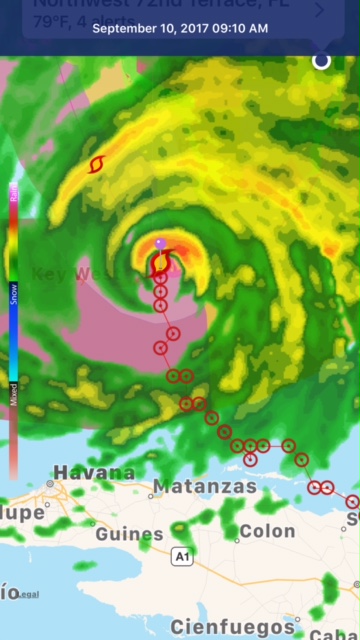 The purple pin is our home, the Hurricane icon is Irma! As predicted, Irma made land fall in Cudjoe Key. This storm was reported to be one of the strongest, largest hurricanes since the 1800s.