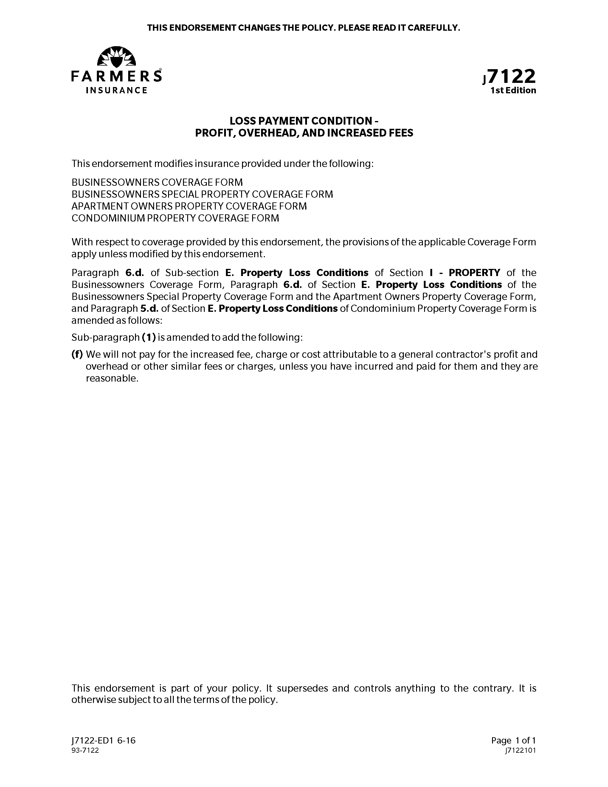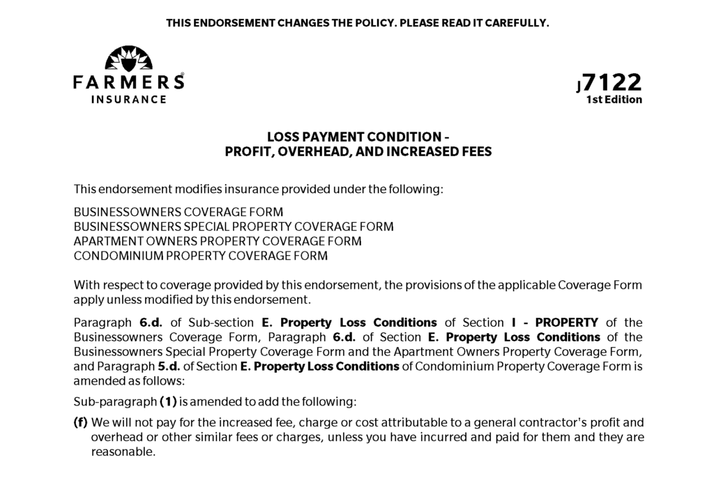 In Crazy New Policy Language? Report It To United Policyholders!, I posted about rogue insurance company tactics used to get a competitive advantage; the following endorsement to the Farmers Insurance business policy is a classic example: