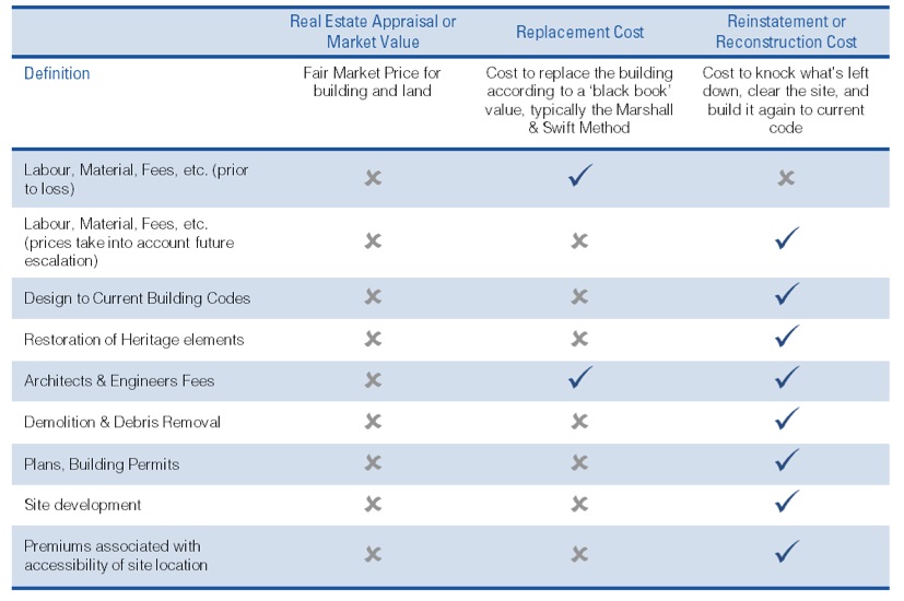 Because it is theoretical replacement with a similar type of building and not an actual reconstruction cost evaluation, which includes for all costs associated with reconstructing a building at today’s standards and codes. Other costs are not considered with replacement cost, such as demolition of the existing destroyed building. While replacement cost is merely the cost to replace the building using the same as or far as possible the same material and design as what exists.