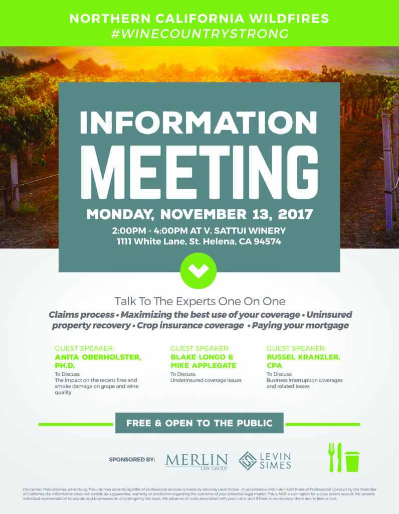 The issues facing wineries affected by the recent fires are complex. From coverage issues related to crop insurance, building damage, loss of business income, and loss of business personal property, Merlin Law Group and Levin Simes have teamed up and are offering a free Information Meeting on Monday, November 13, 2017 from 2:00-4:00p.m. at V. Sattui Winery in St. Helena, California, to answer questions wineries may have regarding their insurance claims.
