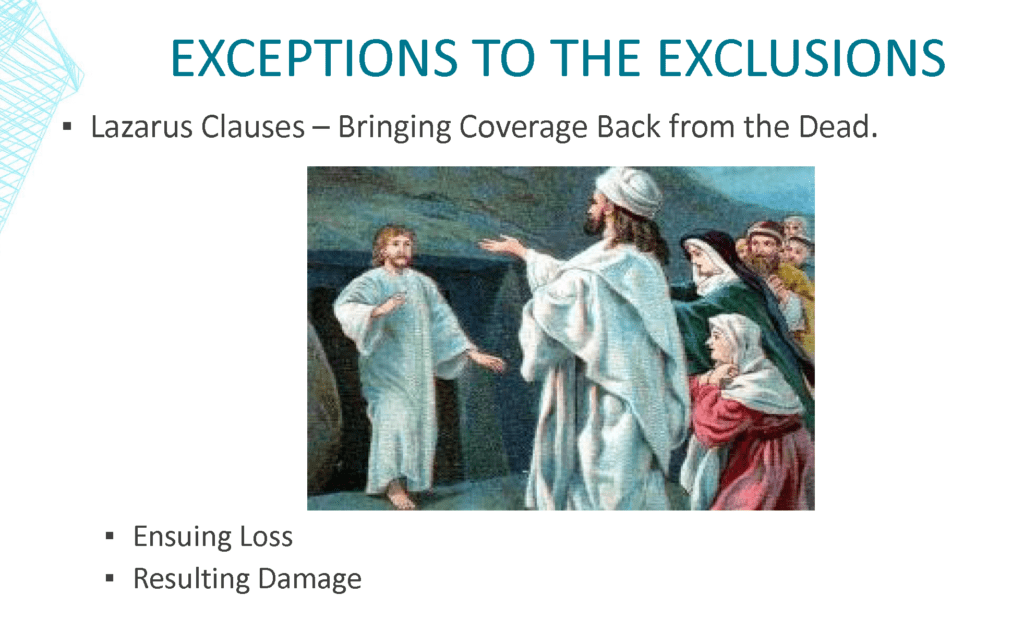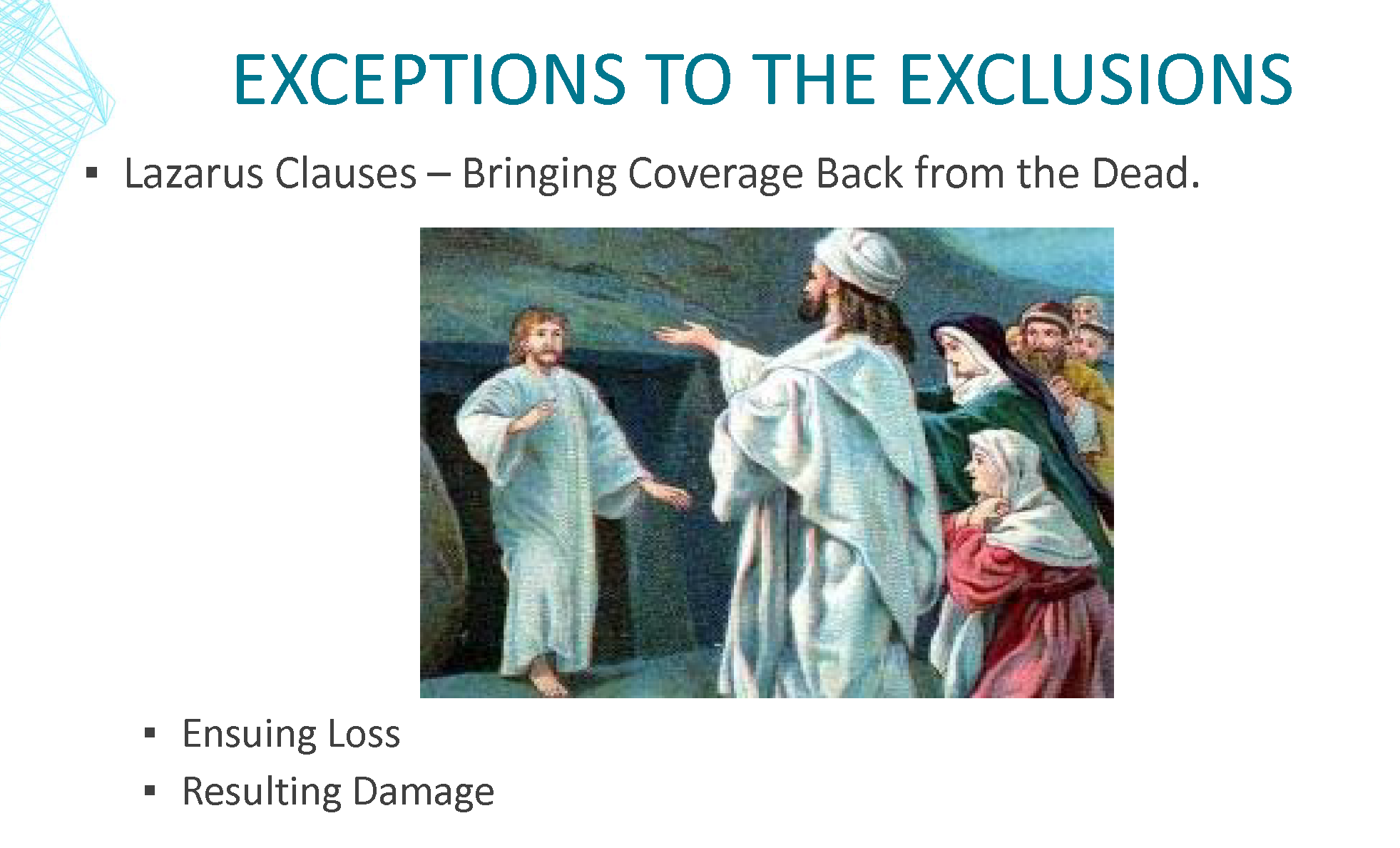I often call ensuing loss clauses the “Lazarus clauses” of property insurance policies. This is because insurers may claim that a loss is not covered citing an exclusion but fail to note the broad grants of coverage afforded by the ensuing loss provisions which are extraordinarily important to making the insurance product work as intended. Victor Jacobellis made the following slide for our presentation: