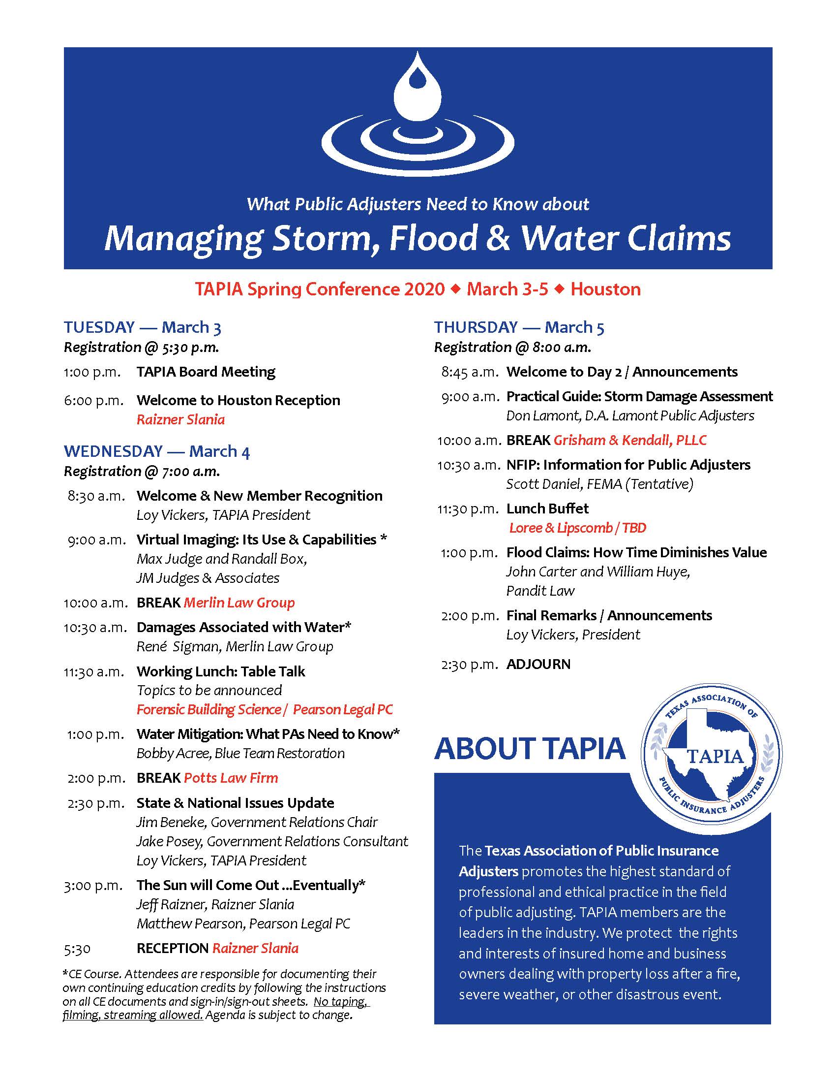 Starting next Tuesday evening March 3 through March 5, TAPIA will be holding various educational seminars about storm, flood, and water insurance claims. Here is the agenda.