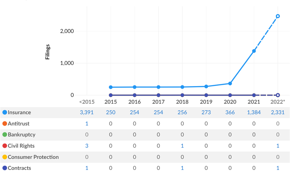 In Oklahoma, we’ve been keeping a close eye on State Farm Fire and Casualty Company and its claims handling practices, as it seems something within State Farm has changed, making litigation against it more frequent. This graphic depicting the trajectory of insurance-related lawsuits involving State Farm in federal courts throughout the country is telling:1